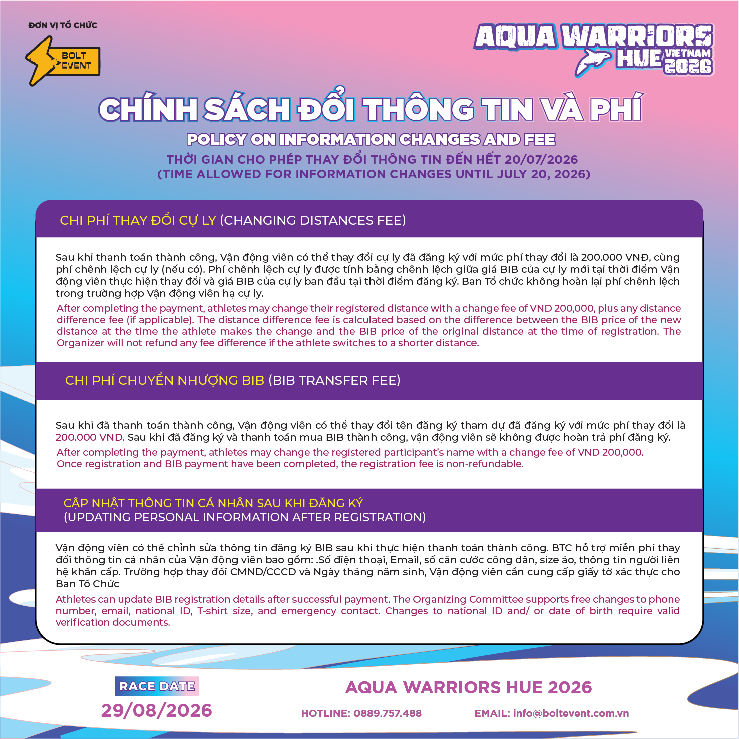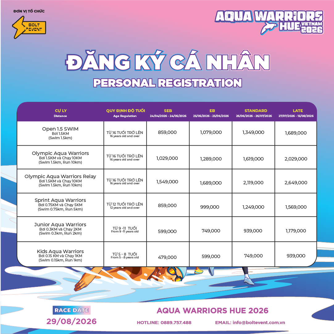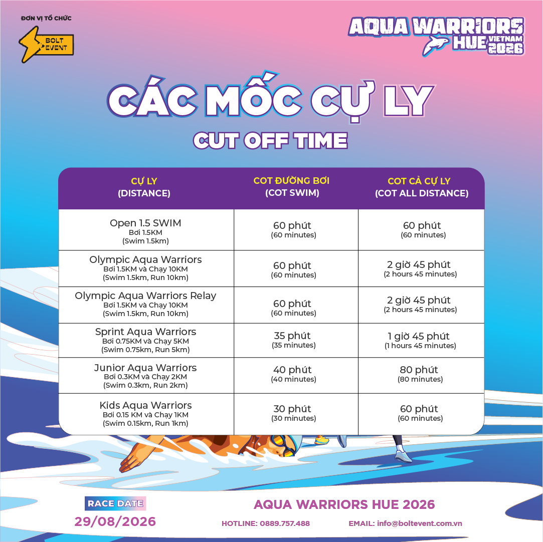 Aqua Warriors Huế là giải đấu thể thao 2 môn phối hợp Bơi-Chạy (Aquathlon) được tổ chức lần đầu tiên ở thành phố Huế, nằm trong chuỗi Aqua Warriors Vietnam Series sở hữu bởi BOLT EVENT, đơn vị có nhiều kinh nghiệm tổ chức các sự kiện thể thao sức bền.