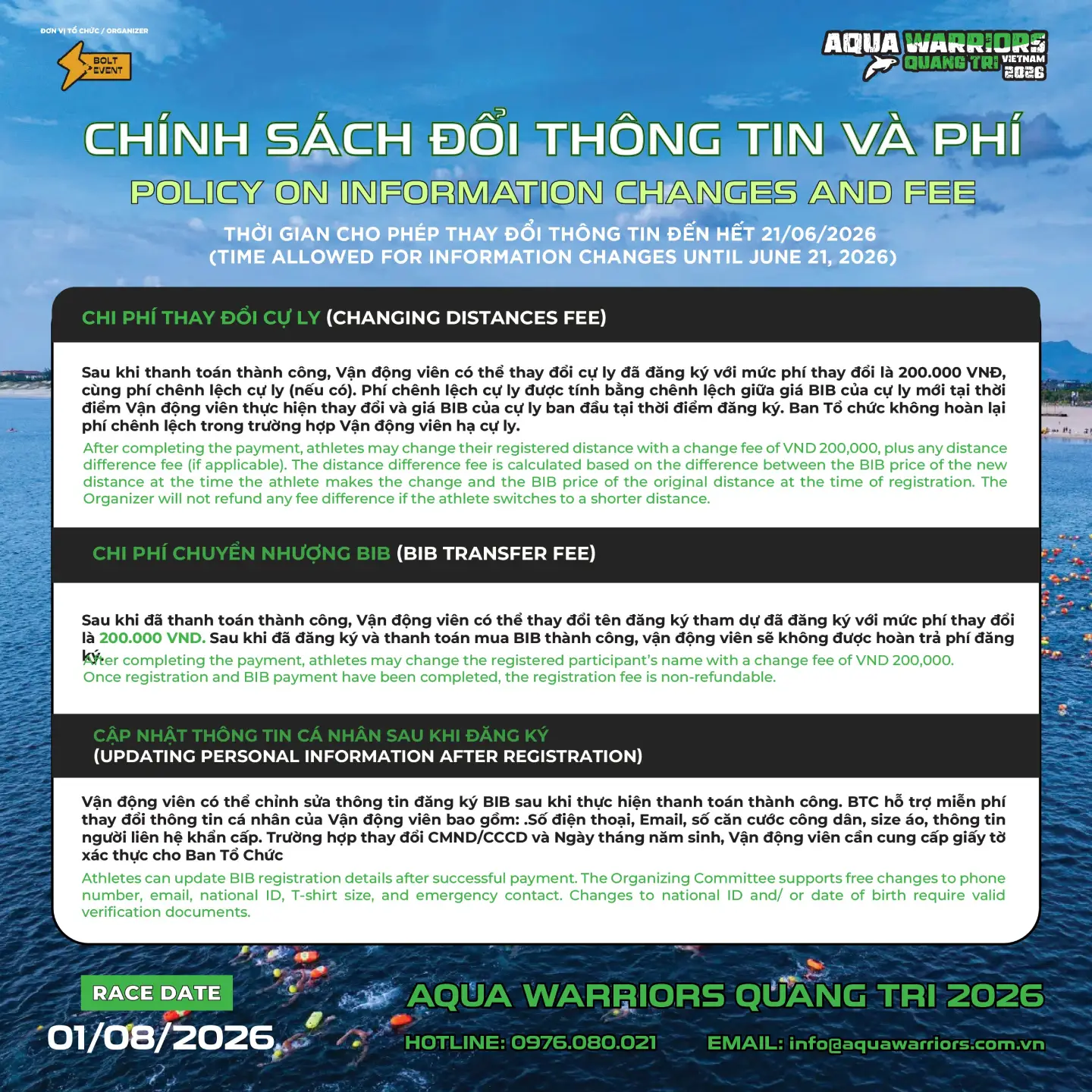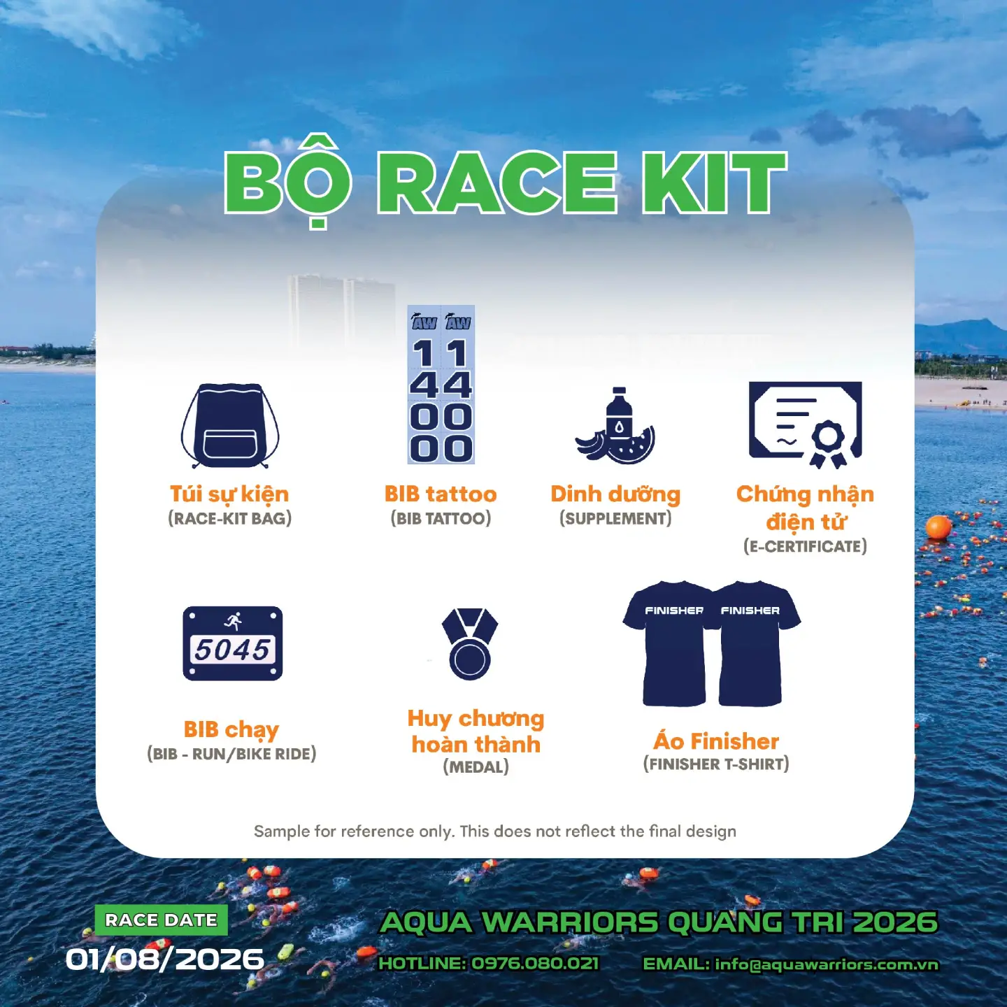 Trên đường bơi, vận động viên sẽ được đắm mình giữa không gian khoáng đạt, khám phá vẻ đẹp hoang sơ, trong lành của biển Bảo Ninh – nơi thiên nhiên vẫn giữ trọn nét nguyên bản và hùng vĩ. Aqua Warriors Quảng Trị không chỉ là một cuộc đua, mà là hành trình trải nghiệm, nơi mỗi nhịp bơi là một bước tiến vượt giới hạn của chính mình.