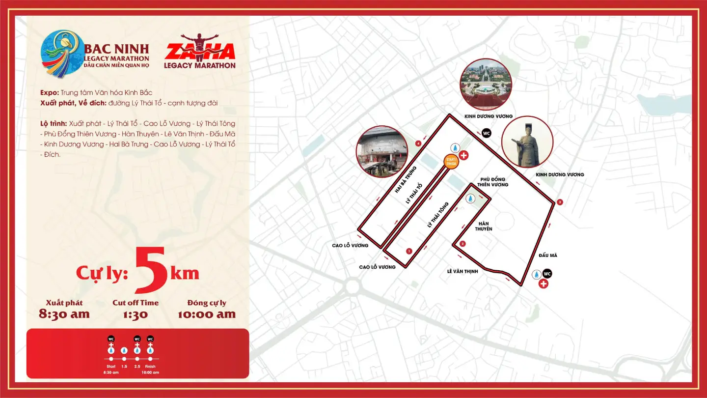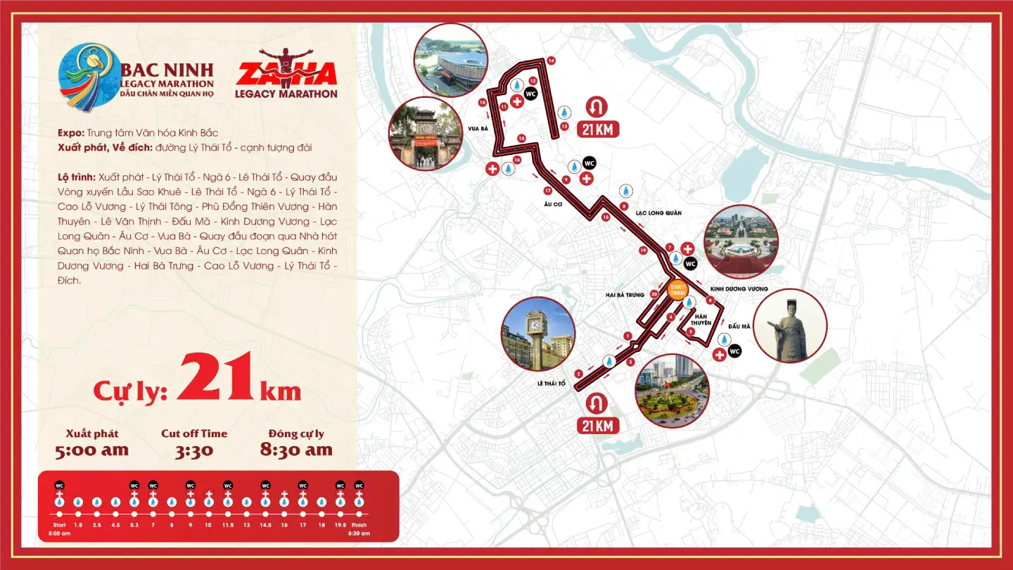 Cung đường chạy sẽ qua các di tích thắng cảnh nổi tiếng: Đền Bà chúa kho, Đền Cùng Giếng Ngọc, Hội Lim, Thành Cổ, Nhà hát Quan Họ, TTVH Kinh Bắc, … kết nối các giá trị truyền thống và lan tỏa hình ảnh Bắc Ninh - Giải chạy Bắc Ninh Legacy Marathon - Dấu chân Miền Quan họ 2026 dự kiến thu hút 8000 vận động viên, trong đó có cả Vận động viên chuyên nghiệp và phong trào có thành tích cao, vận động viên Quốc tế tham dự.