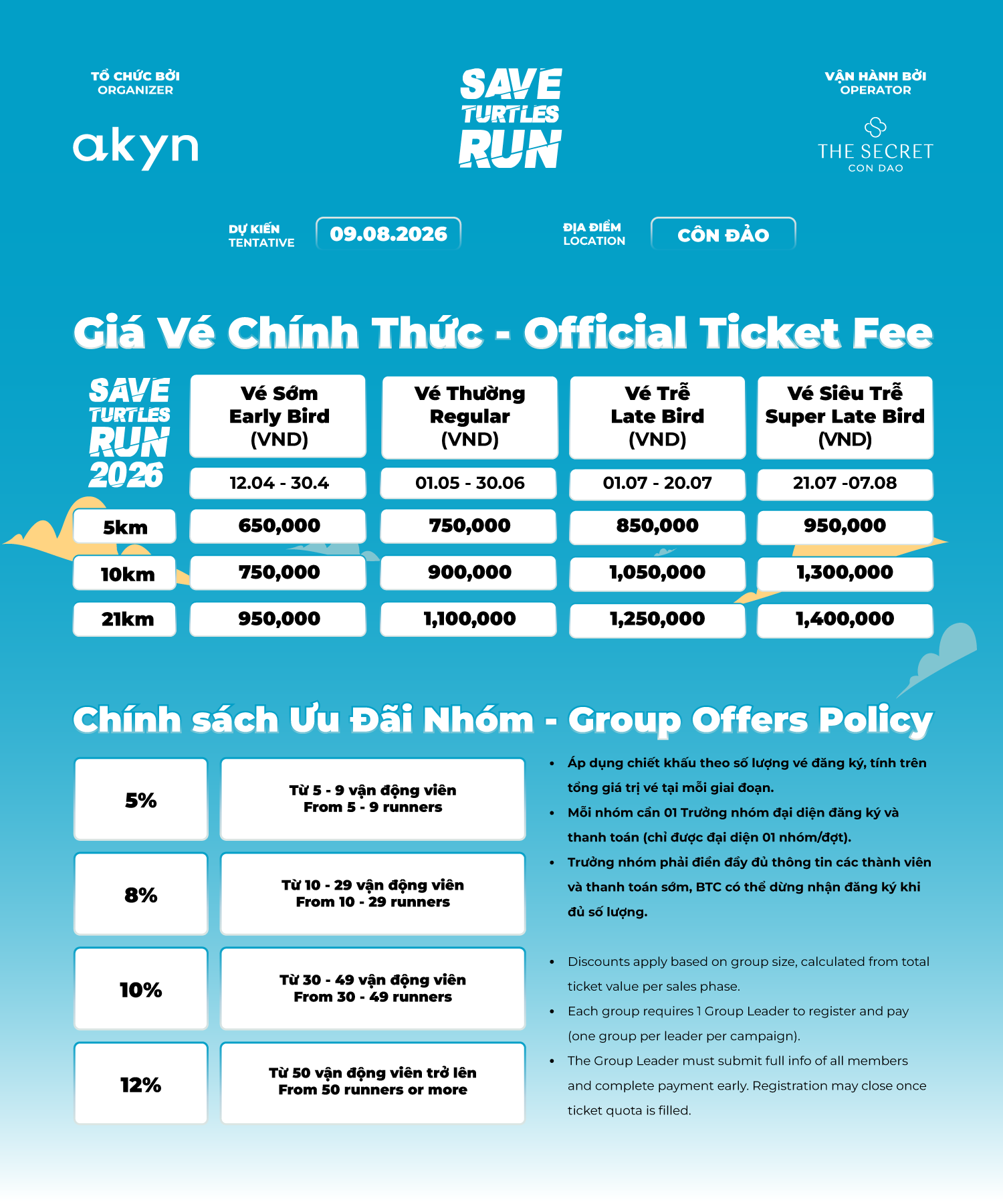 Chạy Bộ Vì Rùa Biển với thông điệp “Mỗi Bước Chạy, Vạn Dặm Xanh” là sự kiện thường niên do Tập đoàn Khách sạn AKYN và The Secret Côn Đảo khởi xướng, nhằm lan tỏa nhận thức về bảo tồn rùa biển và thúc đẩy du lịch bền vững tại Côn Đảo – một trong những điểm đến hiếm hoi còn giữ được vẻ đẹp nguyên sơ và được xem là “vùng an cư” của loài rùa quý hiếm.