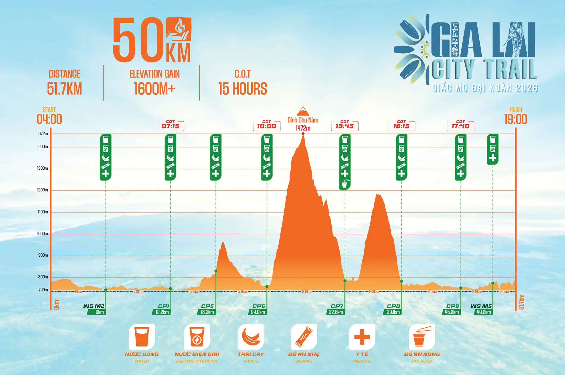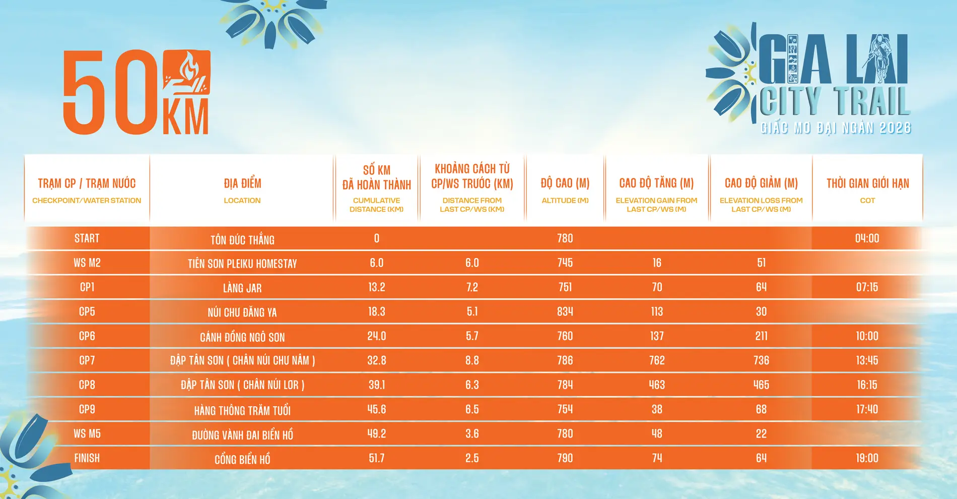 | 50KM | Từ 18 tuổi trở lên | 15 tiếng |