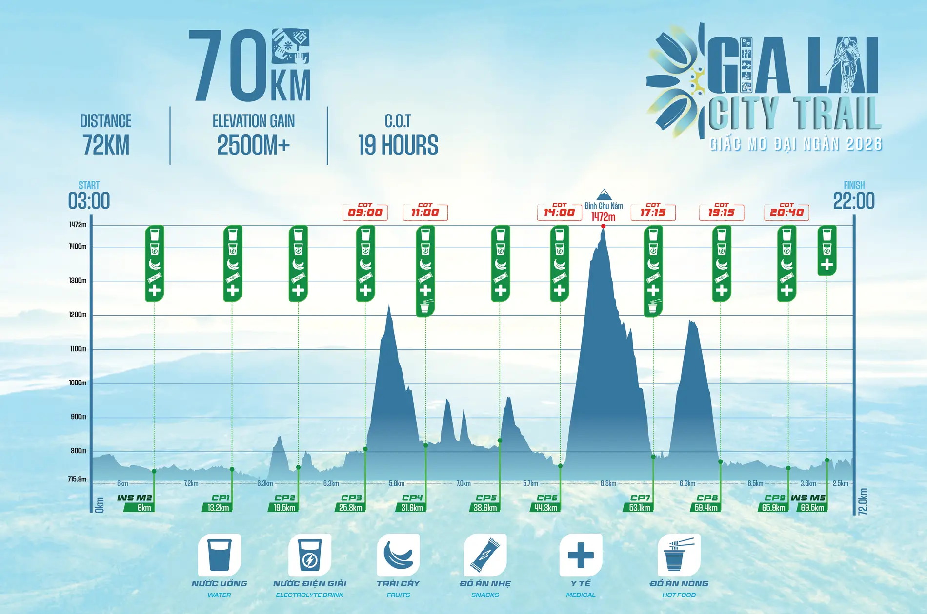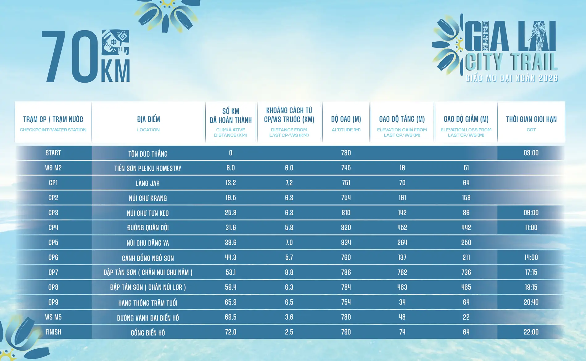 | 70KM | Từ 18 tuổi trở lên | 19 tiếng |