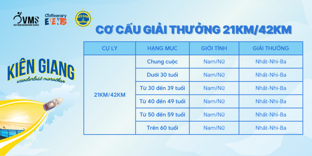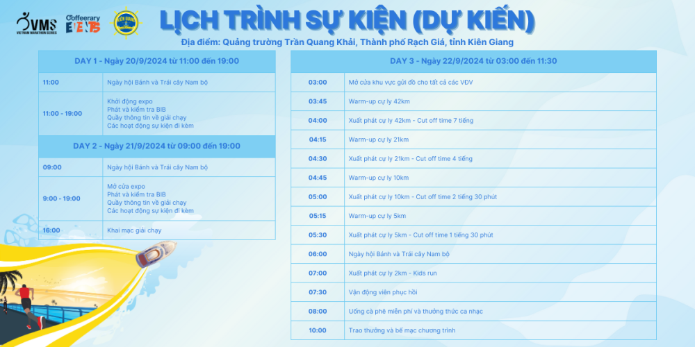 Giải chạy Kien Giang Wanderlust Marathon 2024 sẽ được diễn ra vào ngày 22/9/2024 tại Tp.Rạch Giá, tỉnh Kiên Giang. Đây là giải chạy Full marathon đầu tiên diễn ra tại thành phố biển xinh đẹp này, các cự ly của giải bao gồm 42km, 21km, 10km, 5km và 2km cho trẻ em từ 6 tới 12 tuổi.