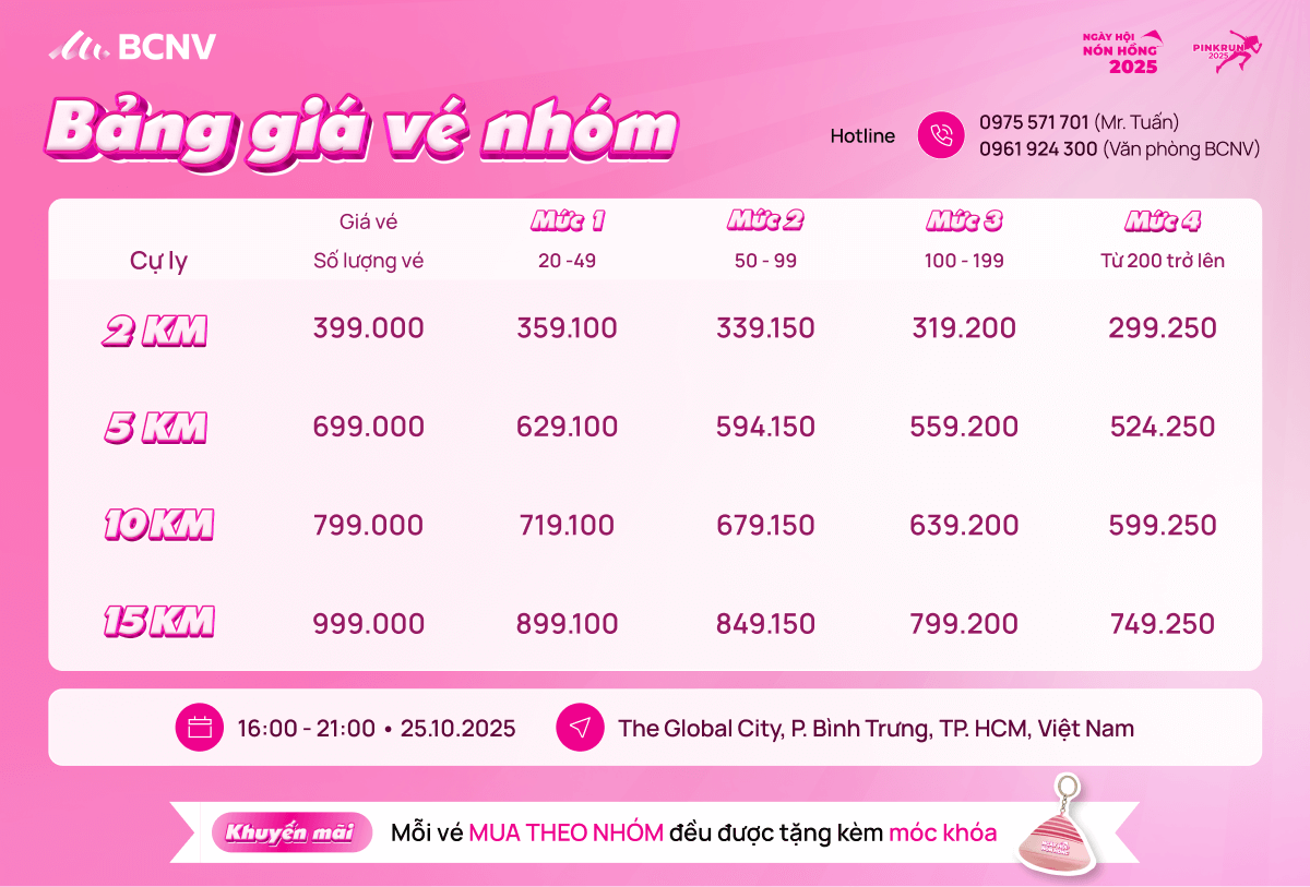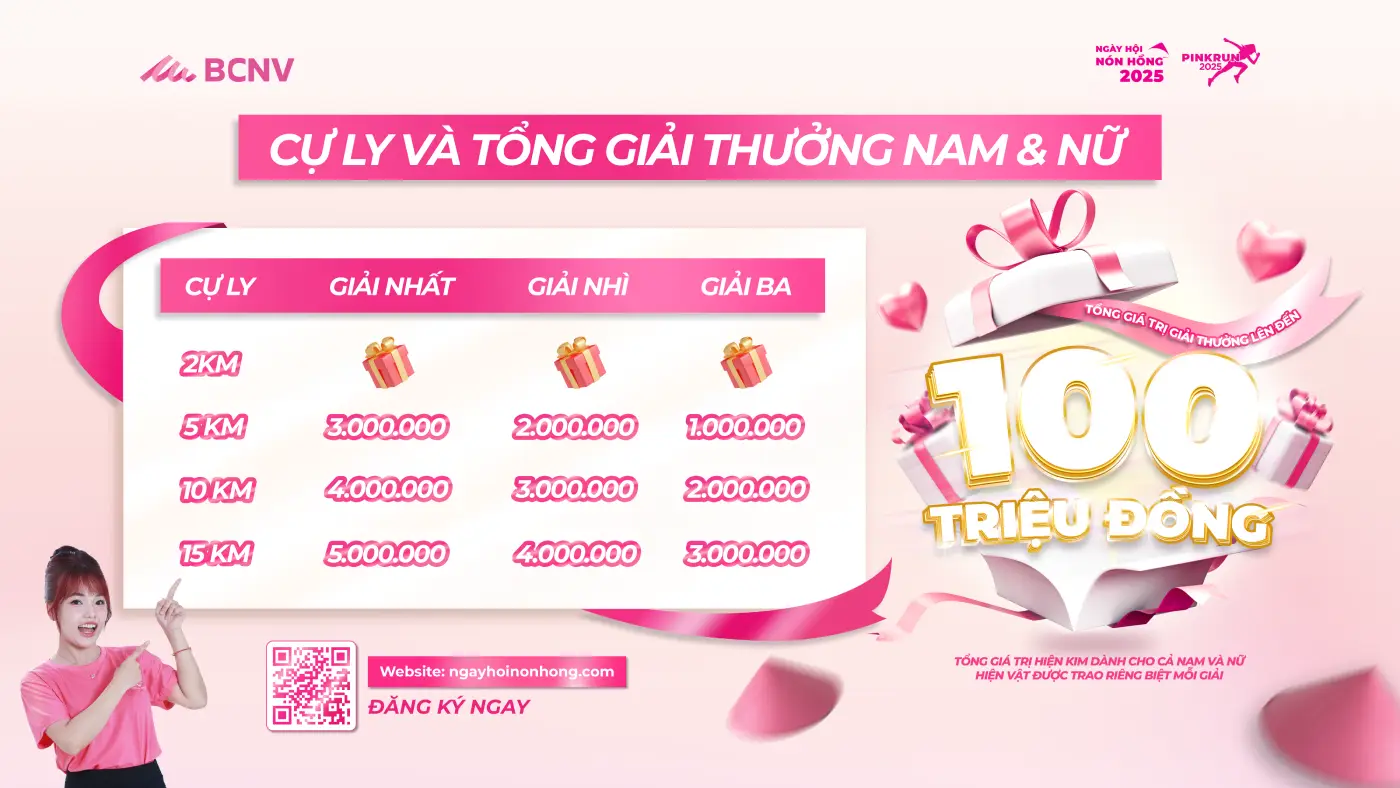 Pink Run - Giải Chạy Hồng, với 04 cự ly lần lượt 2km, 5km, 10km, 15km, là một trong những hoạt động nổi bật thuộc sự kiện Ngày Hội Nón Hồng 2025, góp phần tạo ra những khoảnh khắc ý nghĩa kết nối bệnh nhân, người thân, bạn bè và cộng đồng. Chúng ta không chỉ chạy một mình, chúng ta chạy vì người mình yêu và còn chạy vì một cộng đồng khỏe mạnh.