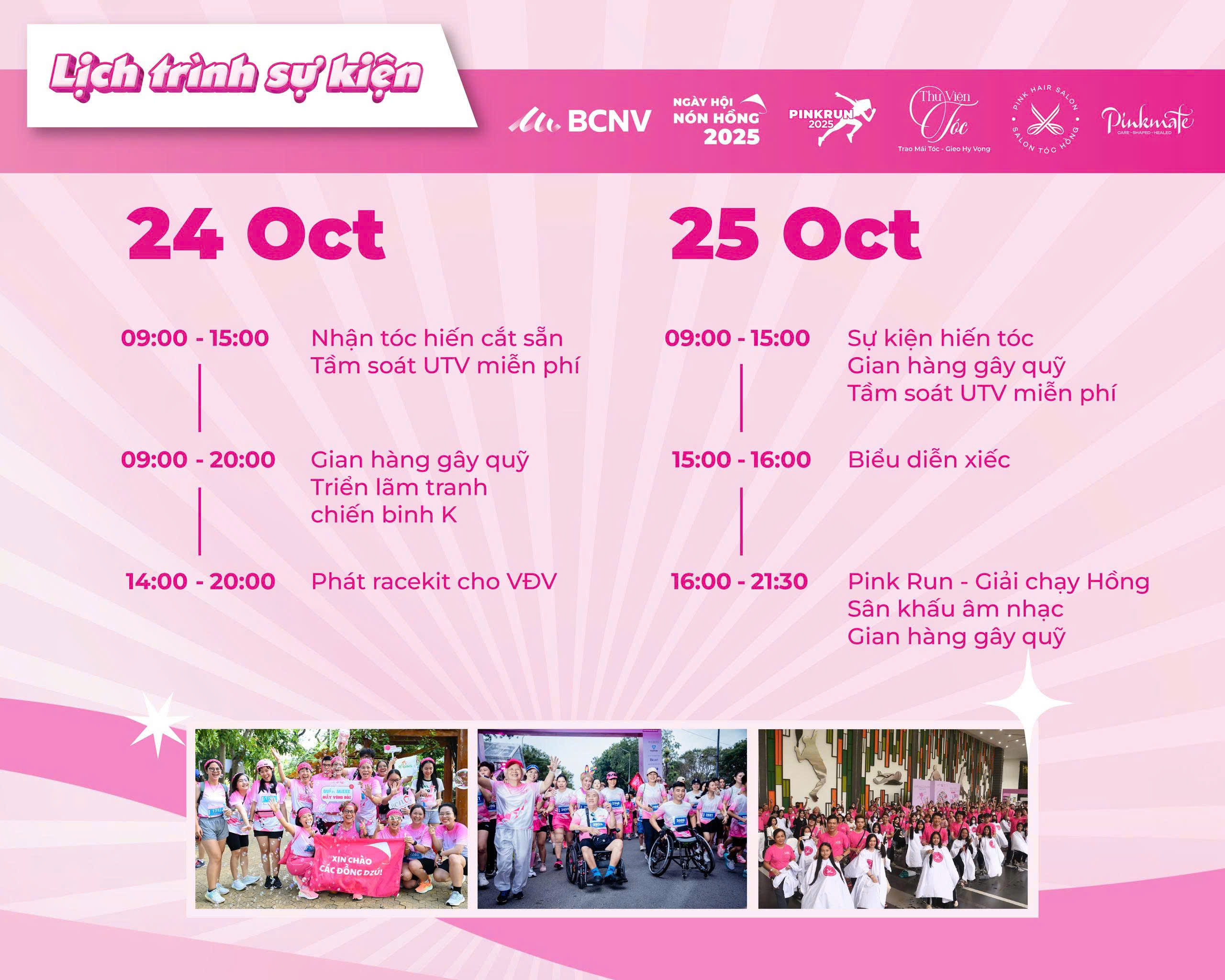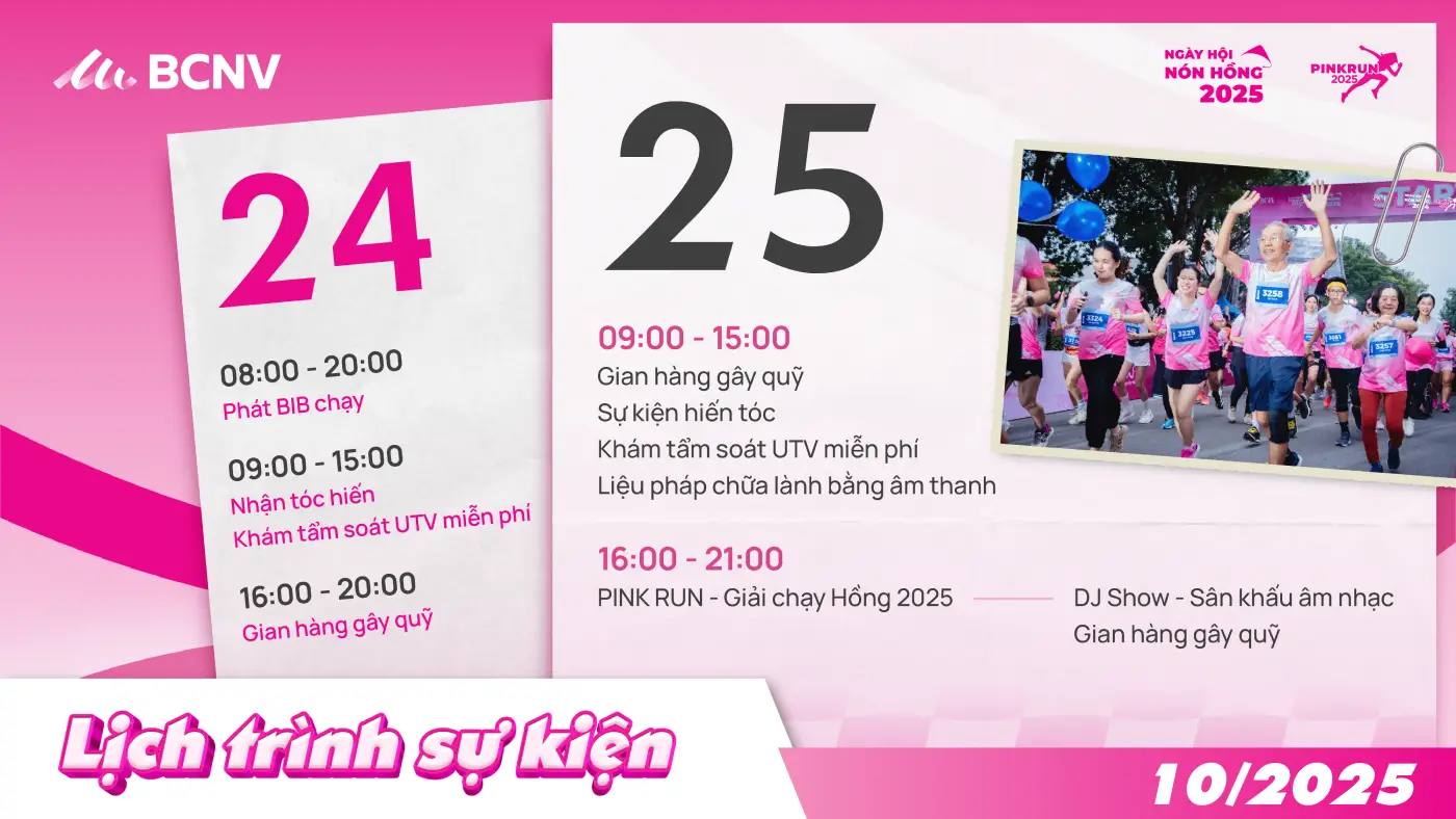 Pink Run - Giải Chạy Hồng là một hoạt động gây quỹ nằm trong khuôn khổ Ngày Hội Nón Hồng 2025. Đây là sự kiện thường niên của Mạng lưới Ung thư vú Việt Nam (BCNV), tổ chức vào tháng 10 - tháng nâng cao nhận thức về ung thư vú trên toàn thế giới với sự hưởng ứng của 195 quốc gia. Không chỉ là một ngày hội, đây còn là cơ hội để chúng ta kết nối, chia sẻ yêu thương đến những chiến binh K đang sống và chiến đấu với bệnh tật.