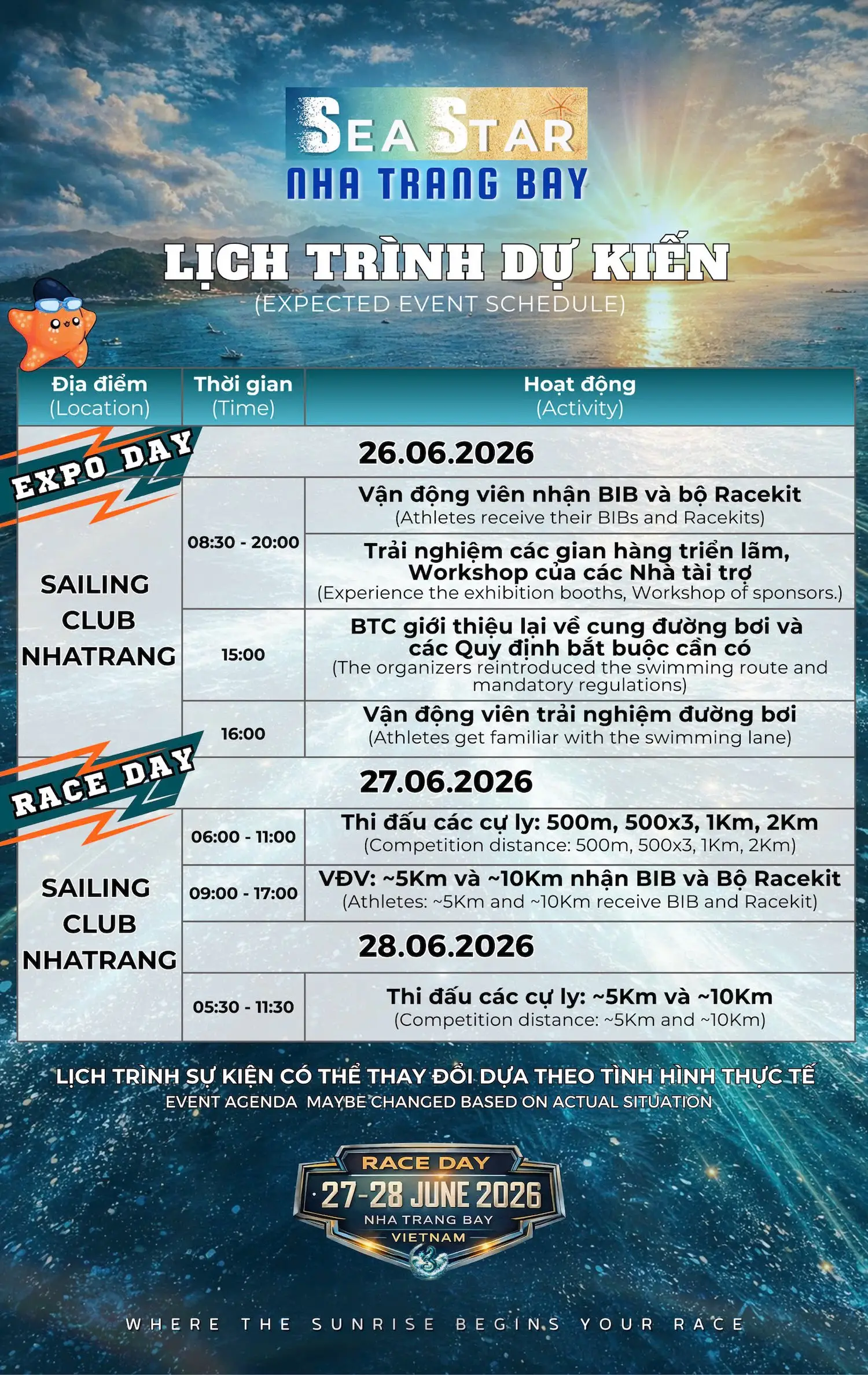Giữa sắc xanh trong veo của vịnh Nha Trang, mỗi vận động viên đều có một hành trình riêng. Từ 500m cho những bước khởi đầu can đảm đến 10km cho những trái tim bền bỉ nhất, mọi cự ly đều là một lời thử thách và cũng là một cơ hội trưởng thành.