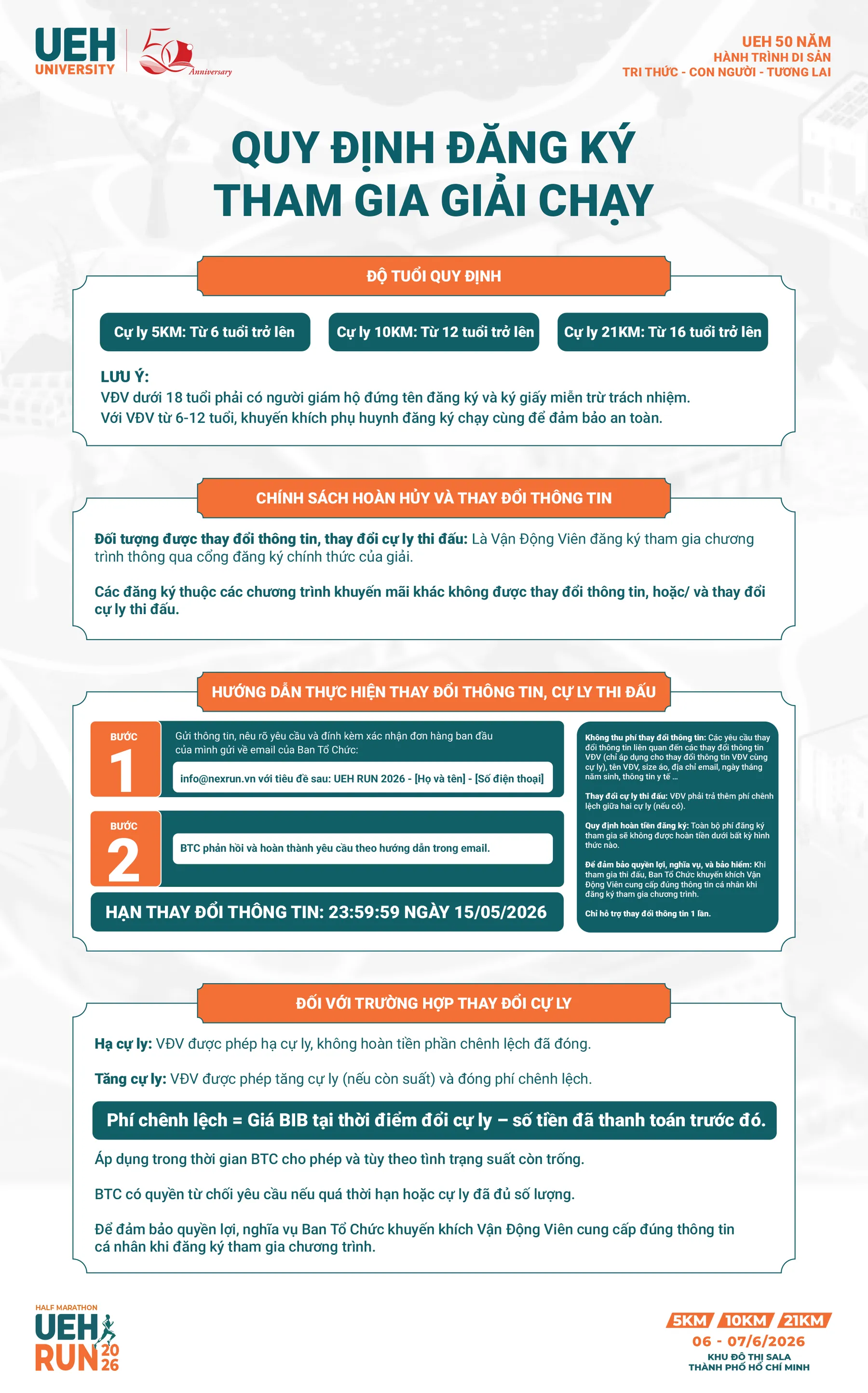 UEH Run Half Marathon 2026 bao gồm 3 cự ly chạy, mỗi cự ly mang một ý nghĩa biểu trưng cho từng giai đoạn phát triển của UEH: