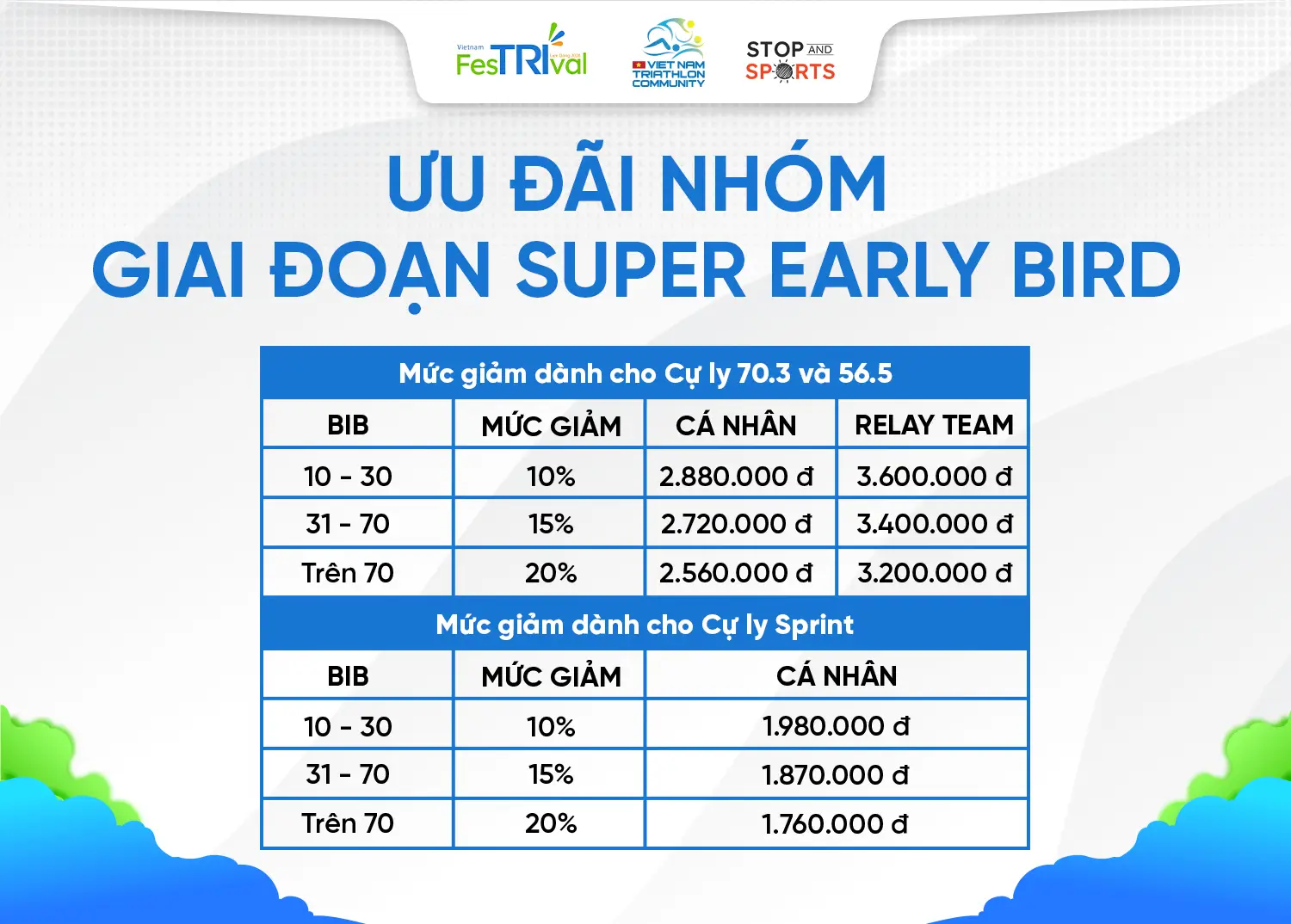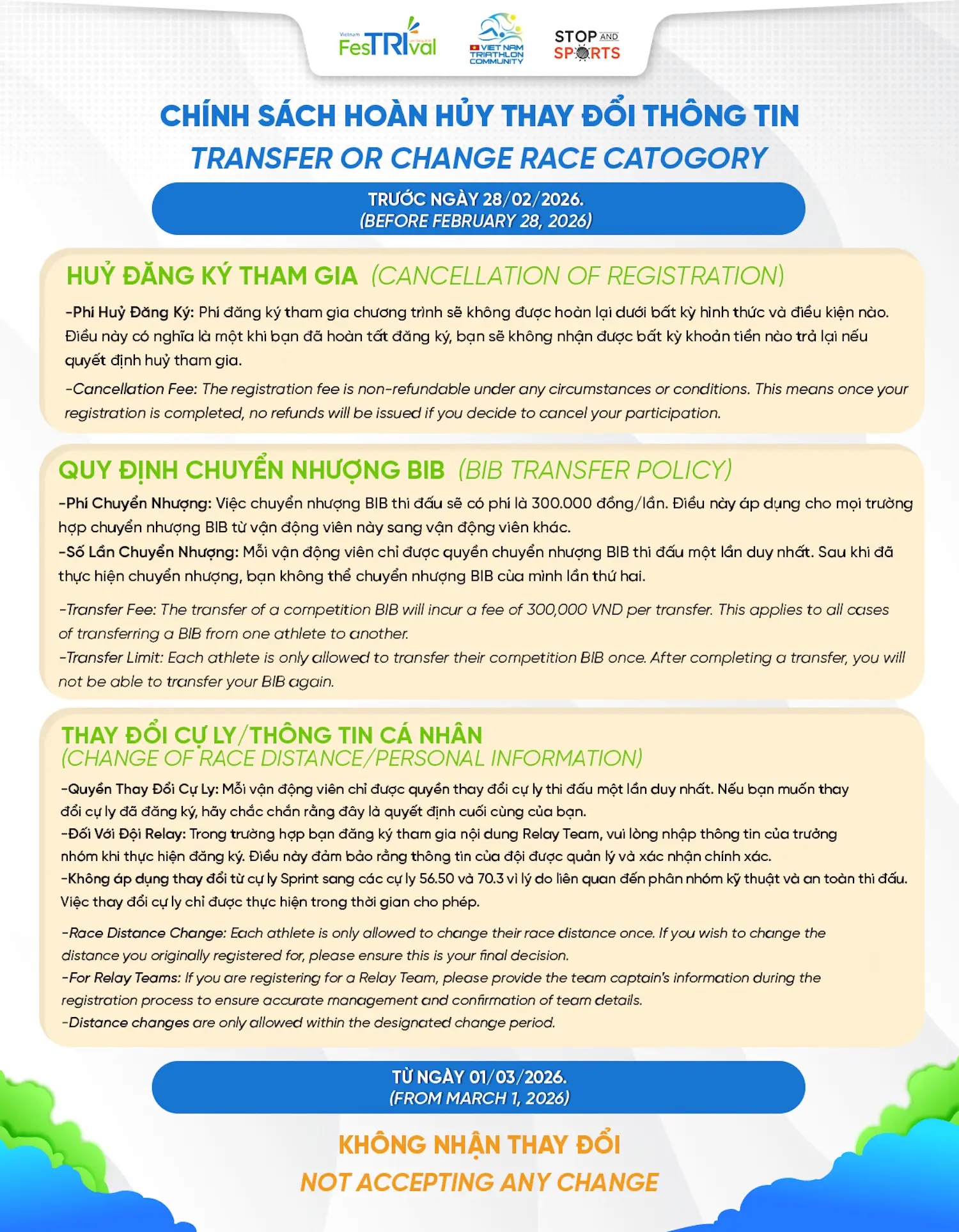 Với tiêu chí “HEAD TO TOE”, “DOOR TO DOOR“, đến với Vietnam FesTRIval các đồng TRI sẽ được hỗ trợ từ thi đấu, lưu trú, ăn uống, di chuyển, vận chuyển xe đạp, … các VĐV chỉ cần chuẩn bị 1 tinh thần sẵn sàng để đến và trải nghiệm.