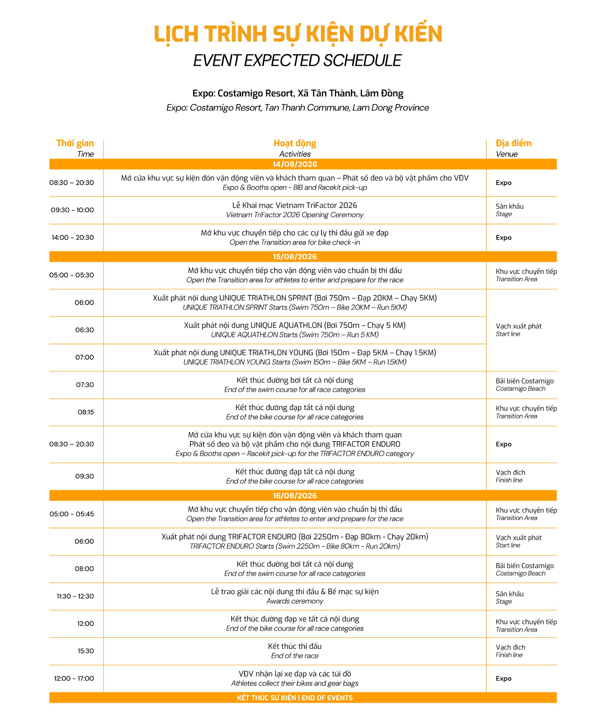 Vietnam TriFactor 2026 sẽ chính thức diễn ra từ 14 – 16/08/2026 tại Costamigo Signature Home Resort (Xã Tân Thành, Tỉnh Lâm Đồng) hứa hẹn trở thành sân chơi ba môn phối hợp đẳng cấp, nơi cả gia đình cùng hòa mình vào hành trình chinh phục và tận hưởng kỳ nghỉ hè trọn vẹn.